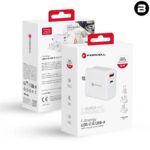 Ładowarka sieciowa Forcell o łącznej mocy 45 W z trzema wymiennymi wtyczkami (EU, UK, US). Obsługuje standardy ładowania Quick Charge 4.0, Power Delivery i pozwala na ładowanie zarówno telefonów i tabletów, jak i laptopów. Posiada dwa porty – USB-A i USB-C.