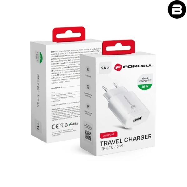 Ładowarka sieciowa do telefonu Forcell F-Energy USB A QC3.0 2,4A 18W + kabel USB A do USB C TFK-TC-1099 biała
