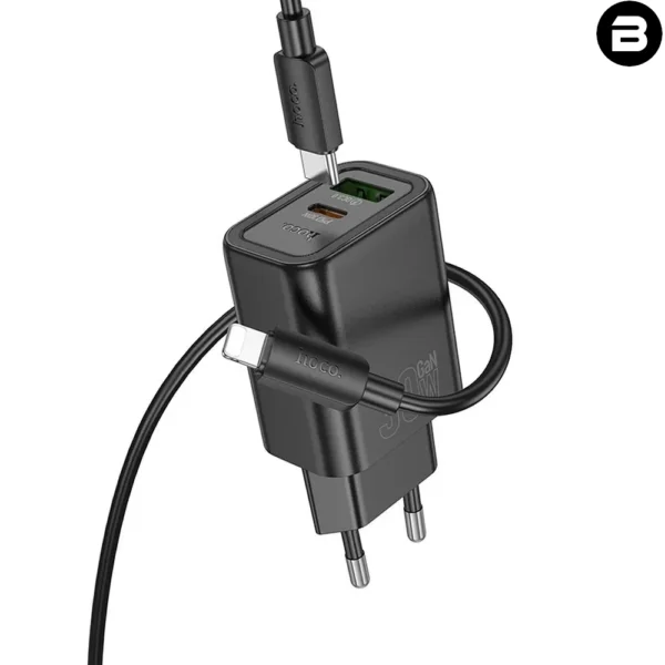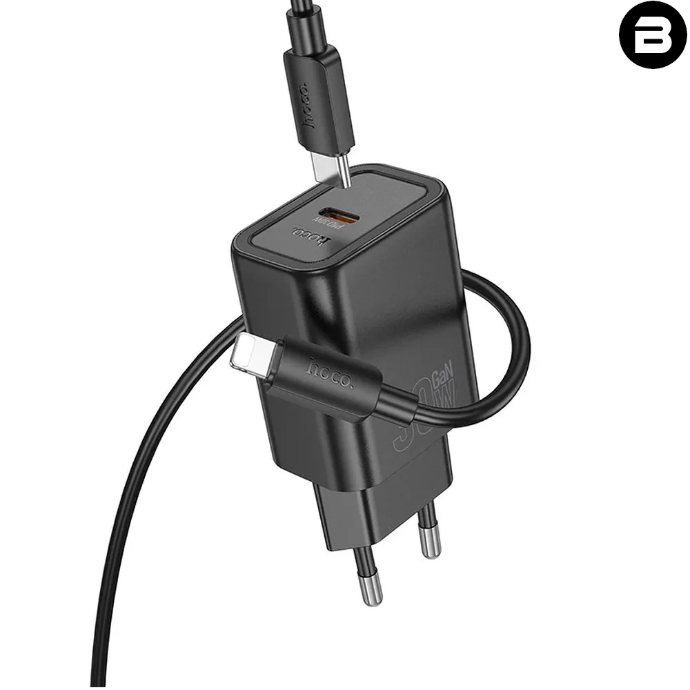 Ładowarka sieciowa Hoco N62 z portem USB-C i obsługą szybkiego ładowania o mocy 30 W. W zestawie z kablem USB-C – Lightning o długości 1 metra.